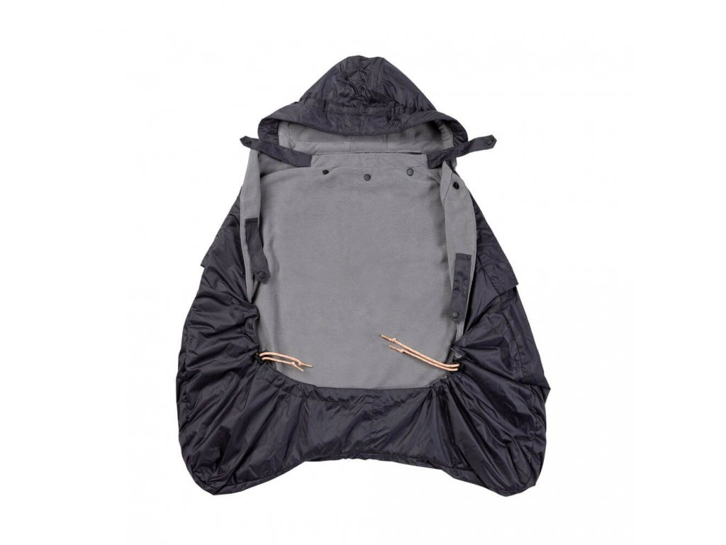 Vyrobeno z voděodolného materiálu a měkké vnitřní podšívky s fleecem, která udrží dítě v teple a suchu. Obsahuje fleecem podšité kapsy pro rodiče.