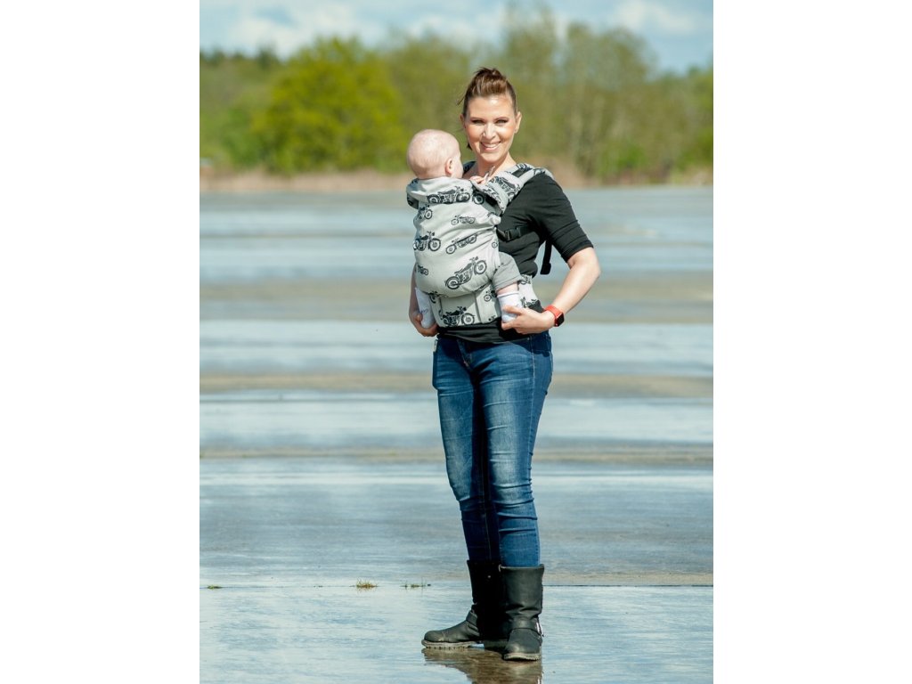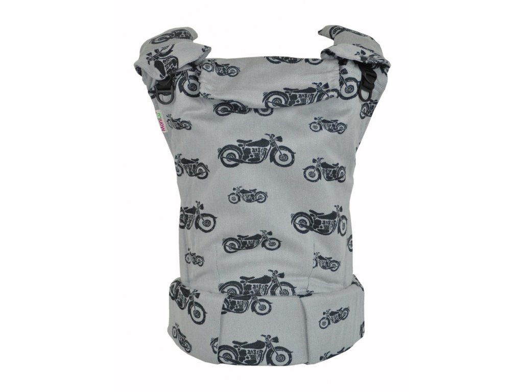 - manipulace - před prvním použití si nastavíte potřebnou šířku středového panelu (zádové opěrky). Bederní pás si zapnete pomocí přezky. Miminko si dáte na hrudník čelem k sobě s roztaženýma nožičkama. Přetáhněte přes miminko středový panel, nasaďte ramenní popruhy, zajistěte a dotáhněte. Větším dětem lze také při nošení vepředu i na zádech zajistit při spaní hlavičku pomocí kapucky k tomu určené.