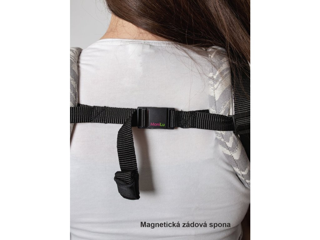 U nových nosítek MoniLu je hrudní přezka magnetická, lze ji ovládat jednou rukou. Zapne se přiblížením obou konců blíže k sobě a rozepne se vysunutím horní části přezky směrem nahoru. Pozici hrudního pásku lze regulovat