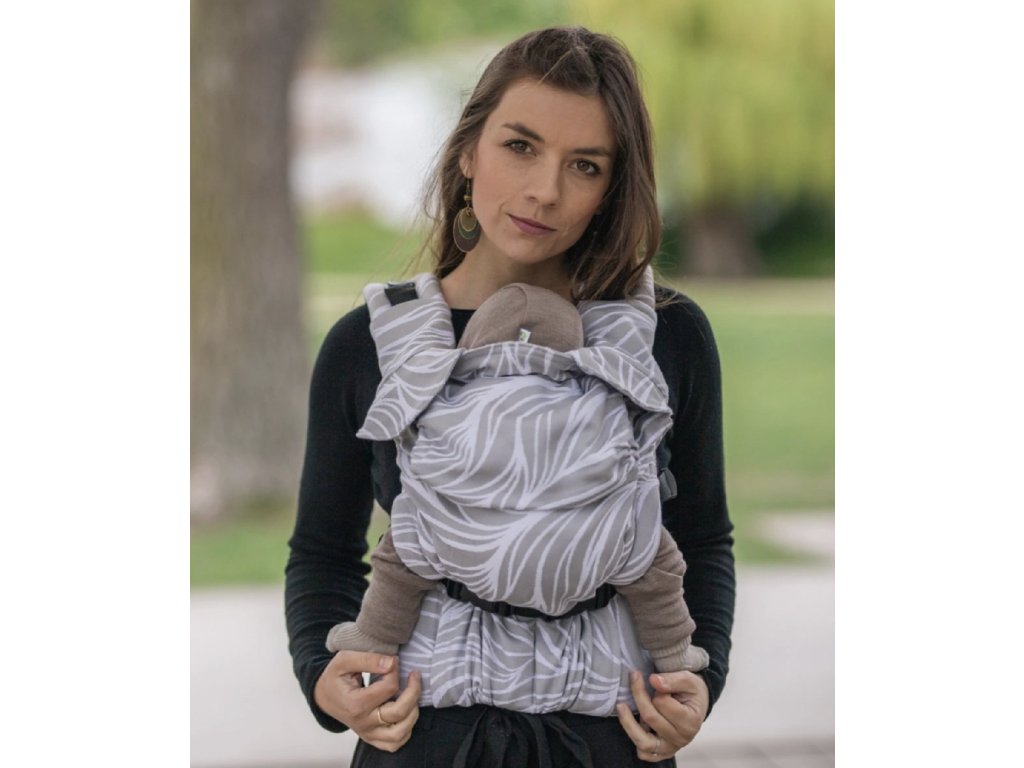 - manipulace - před prvním použití si nastavíte potřebnou šířku středového panelu (zádové opěrky). Bederní pás si zapnete pomocí přezky. Miminko si dáte na hrudník čelem k sobě s roztaženýma nožičkama. Přetáhněte přes miminko středový panel, nasaďte ramenní popruhy, zajistěte a dotáhněte. Větším dětem lze také při nošení vepředu i na zádech zajistit při spaní hlavičku pomocí kapucky k tomu určené.