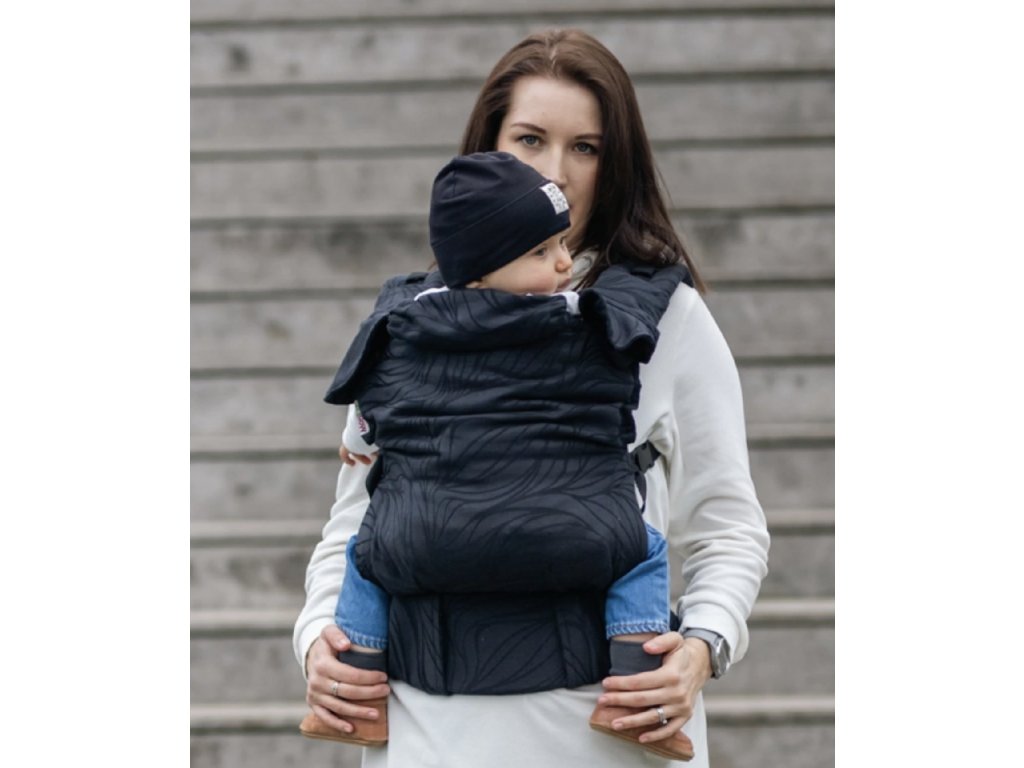 - manipulace - před prvním použití si nastavíte potřebnou šířku středového panelu (zádové opěrky). Bederní pás si zapnete pomocí přezky. Miminko si dáte na hrudník čelem k sobě s roztaženýma nožičkama. Přetáhněte přes miminko středový panel, nasaďte ramenní popruhy, zajistěte a dotáhněte. Větším dětem lze také při nošení vepředu i na zádech zajistit při spaní hlavičku pomocí kapucky k tomu určené.