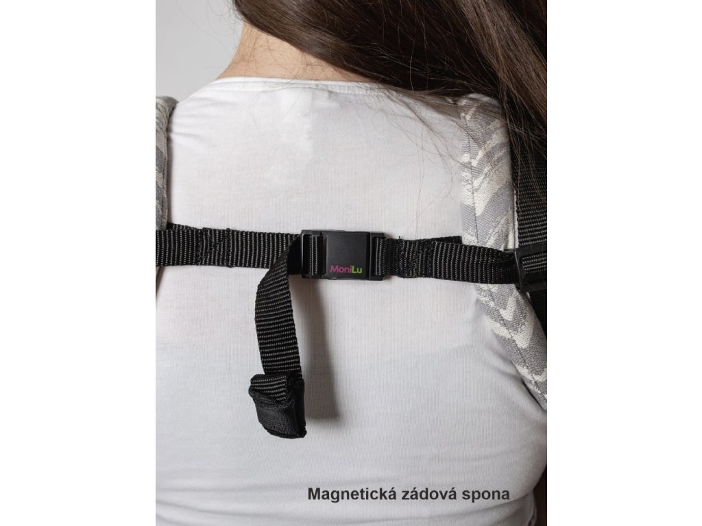 zádová opěrka - lze upravovat šířku i výšku zádové opěrky a přizpůsobit jí tak potřebám rostoucího dítěte. Nosítko MoniLu má unikátní skryté stahování výšky zádové opěrky a šíře sedu. Maximální šíře sedu je 33 cm a maximální výška zádové opěrky 40 cm. Minimální šíře sedu je 13cm a minimální výška zádové opěrky 30 cm. Zádová opěrka je ušita ze dvou vrstev šátku, je měkká a nabízí dítěti přirozenou polohu. Zádová opěrka krásně obepíná dítko, její výška zajišťuje dostatečné podsazení v nosítku a poskytuje mu ergonomickou podporu